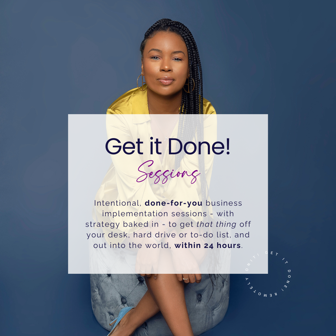 An intentional, done-for-you business implementation session - with strategy baked in - to get that thing off your desk, hard drive or to-do list, and done within 24 hours.